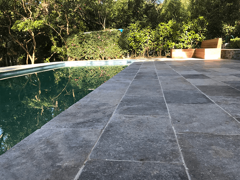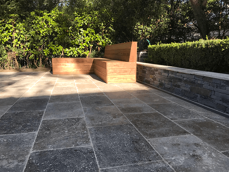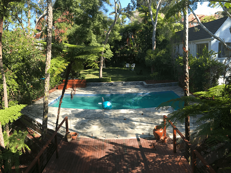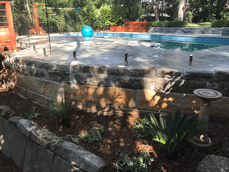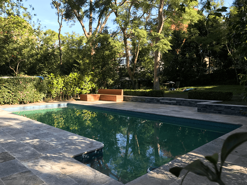 This particular client approached us with a desire to complete an entire makeover of there pool area and front courtyard. The job was completed in two stages, the first being the pool area and the second being the front courtyard a year later. Stage one was to refurbish an existing pool which had been neglected for several years. The paving ad sunk around the pool and the retaining walls had rotted and moved over time. The job consisted of man separate features including, paving a concrete slab around the pool, repairing the sandstone retaining walls, paving around the pool using silver travertine, installation of new stainless-steel strip drains, timber bench seating installed, glass pool fencing and a complete makeover of their garden area.