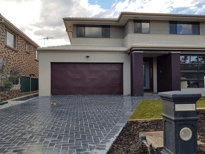 This client was after a whole landscape package with a difference. With that in mind, we suggested a unique bluestone driveway in a herringbone pattern. Other than the bluestone driveway, we also used bluestone slabs for the stepping stones. We then used concrete blocks for the retaining walls, concrete bricks for the edging, synthetic grass for a friendly, kids play area as well as the garden beds and turf to complete the job.