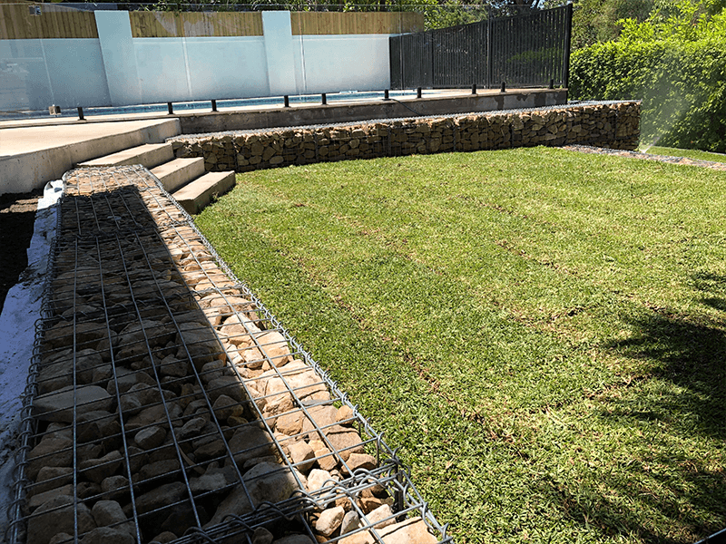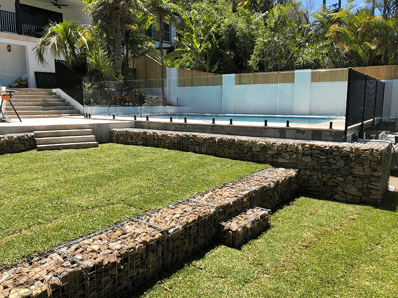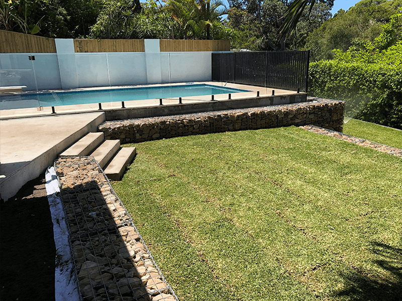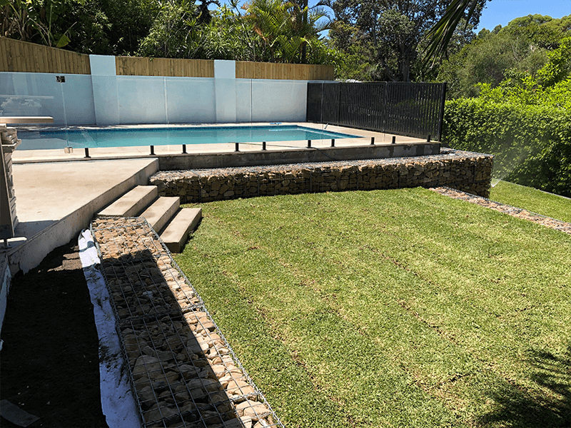 In this quiet residential area of Southern Sydney we worked alongside the client to rejuvenate and release the full potential of this backyard. My team and the client decided to go with travertine paving which adds a timeless look and elegance to any outdoor area and is the ideal choice for any patio, poolside, or seating area.We installed brand new frameless glass pool fencing around the pool area along with sandstone gabion walls for a refined finish. This job also included all soft landscaping works.