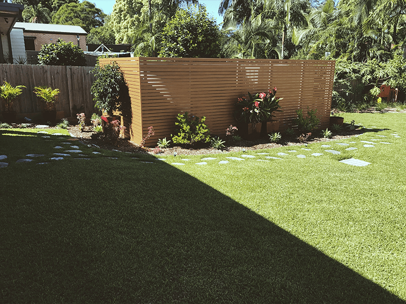 This particular client was after a whole landscape package with an emphasis on being low maintenance. This job consisted of multiple areas and features specific to what the client was after. We provided our clients with boundary retaining walls to level the entire back yard, we then constructed the front brick wall with sandstone capping and aluminium slats, a rock finish driveway, cobblestone seating area with rough sawn sandstone seating, a cast iron fire pit, aluminium screening, gates and decking, bluestone stepping stones, brick edging and a water feature. We also installed lighting, irrigation, garden beds and turfing.